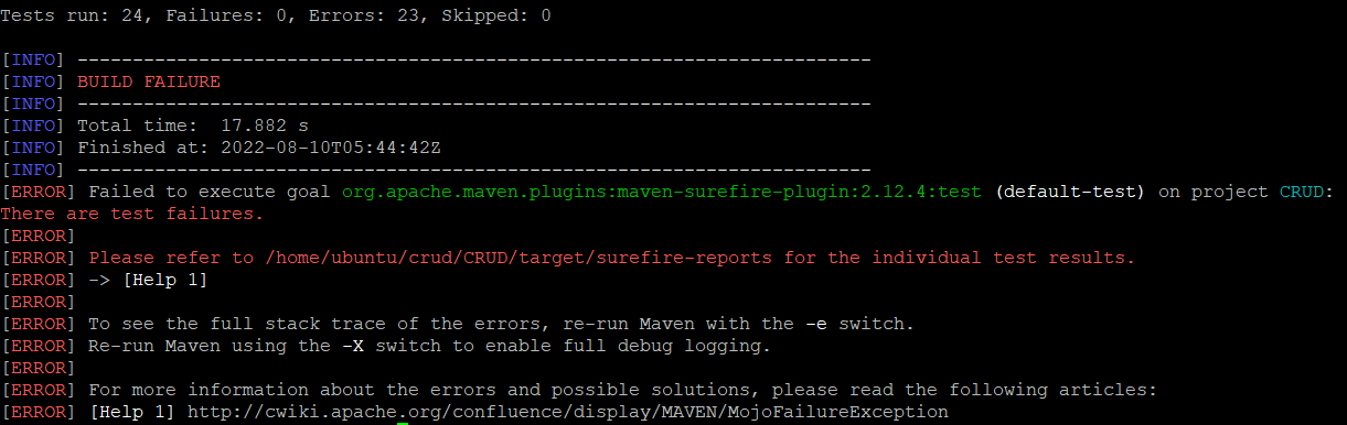 Failed to execute goal org.apache.maven.plugins:maven-surefire-plugin:2.12:test (default-test) on project. - 인프런 | 질문