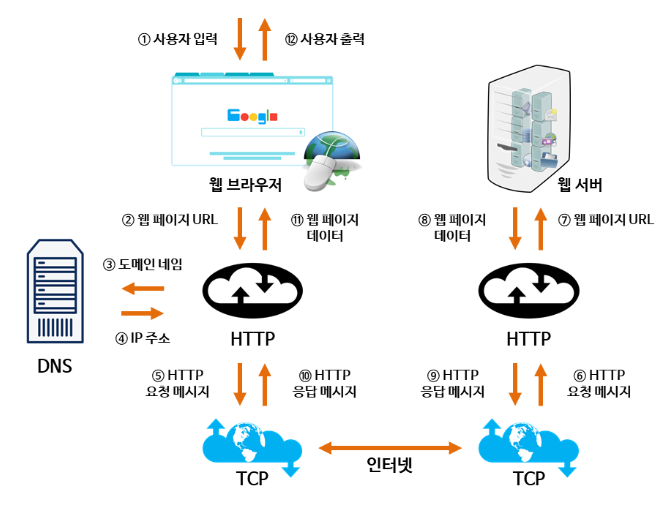 ⑤⑥ 웹 페이지 URL 정보와 전달받은 IP 주소는 HTTP 프로토콜을 사용하여 HTTP 요청 메시지를 생성함.이렇게 생성된 HTTP 요청 메시지는 TCP 프로토콜을 사용하여 인터넷을 거쳐 해당 IP 주소의 컴퓨터로 전송됨.