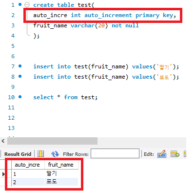 create table test( auto_incre int auto_increment primary key, fruit_name varchar(20) not null );