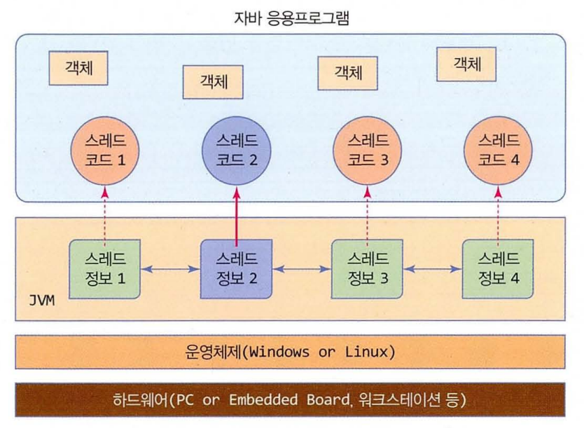 4개의 자바 스레드로 구성된 응용프로그램을 실행하는 JVM 위의 그림은 자바 응용프로그램, 스레드 코드, JVM, 스레드 정보와의 관계를 보여준다. 그림에서 자바 응용프로그램은 4개의 스레드를 생성한 상태이다. 스레드가 생성되면 스레드에 관련된 정보(Thread Control Block, TCB)가 생성되며 이들은 모두 JVM에 의해 관리된다. TCB 정보를 토대로 어떤 스레드를 실행시킬지를 결정하는 스케줄링은 JVM에 의해 이루어진다. 만약 JVM이 스레드2를 선택하면 2번째 TCB에 기록된 스레드2의 코드 주소에서 실행을 시작한다. 위의 그림은 JVM이 스레드2를 선택하여 스레드2의 코드가 실행되고 있는 상태이다. 스레드가 종료되면 해당 TCB는 사라진다. 모든 스레드가 종료되면 JVM이 종료되고 자바 응용프로그램도 종료된다.