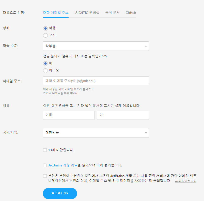 JetBrains(https://www.jetbrains.com/community/education/#students)에 접속해서 하단의 Apply now를 클릭