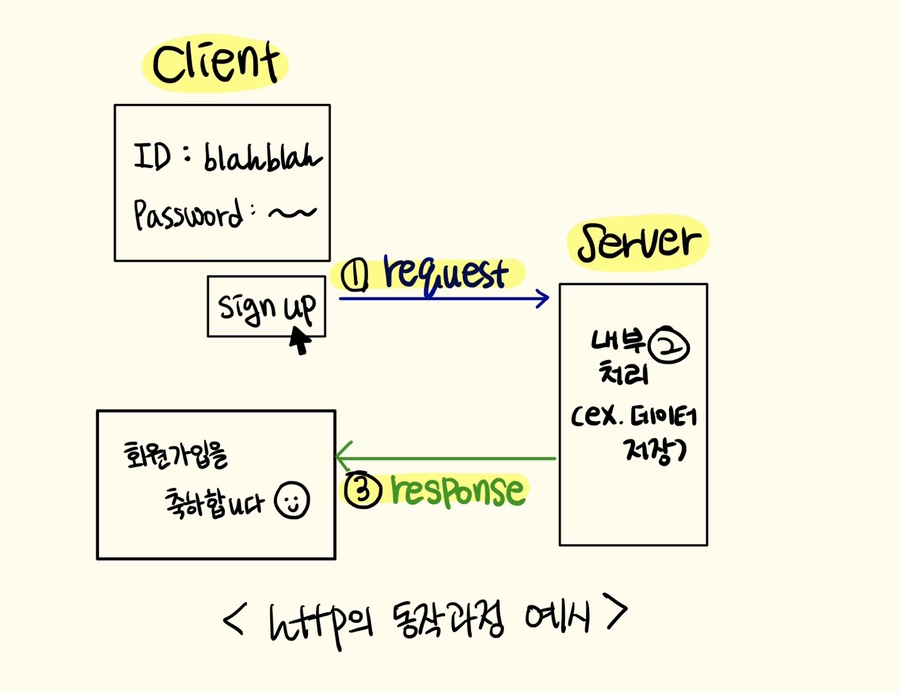 사용자가 브라우저 주소창에 url을 입력하면 브라우저가 그 데이터를 요청하고 보여준다. 요청받은 데이터를 가져오는 것은 웹 서버가 수행해주며 HTTP는 사용자(클라이언트)와 서버간의 규칙이다.