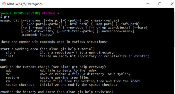 잘 설치되었는지 확인해보기 위해 git이라고 작성하고 엔터쳤을 때
