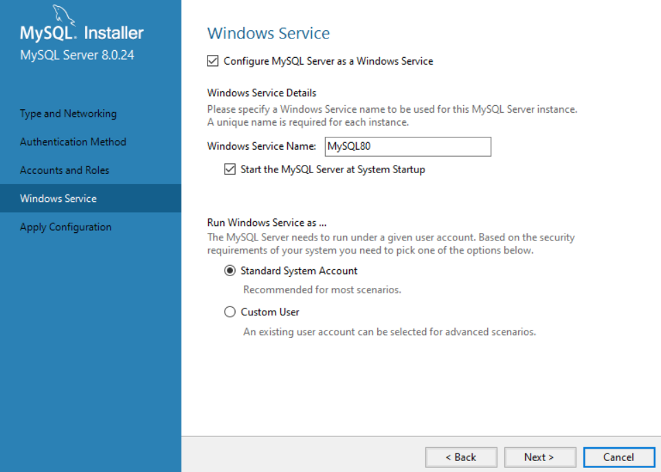Windows Service 이름 설정을 해주면 되는데 나는 그냥 기본값으로 설정해두고 Next