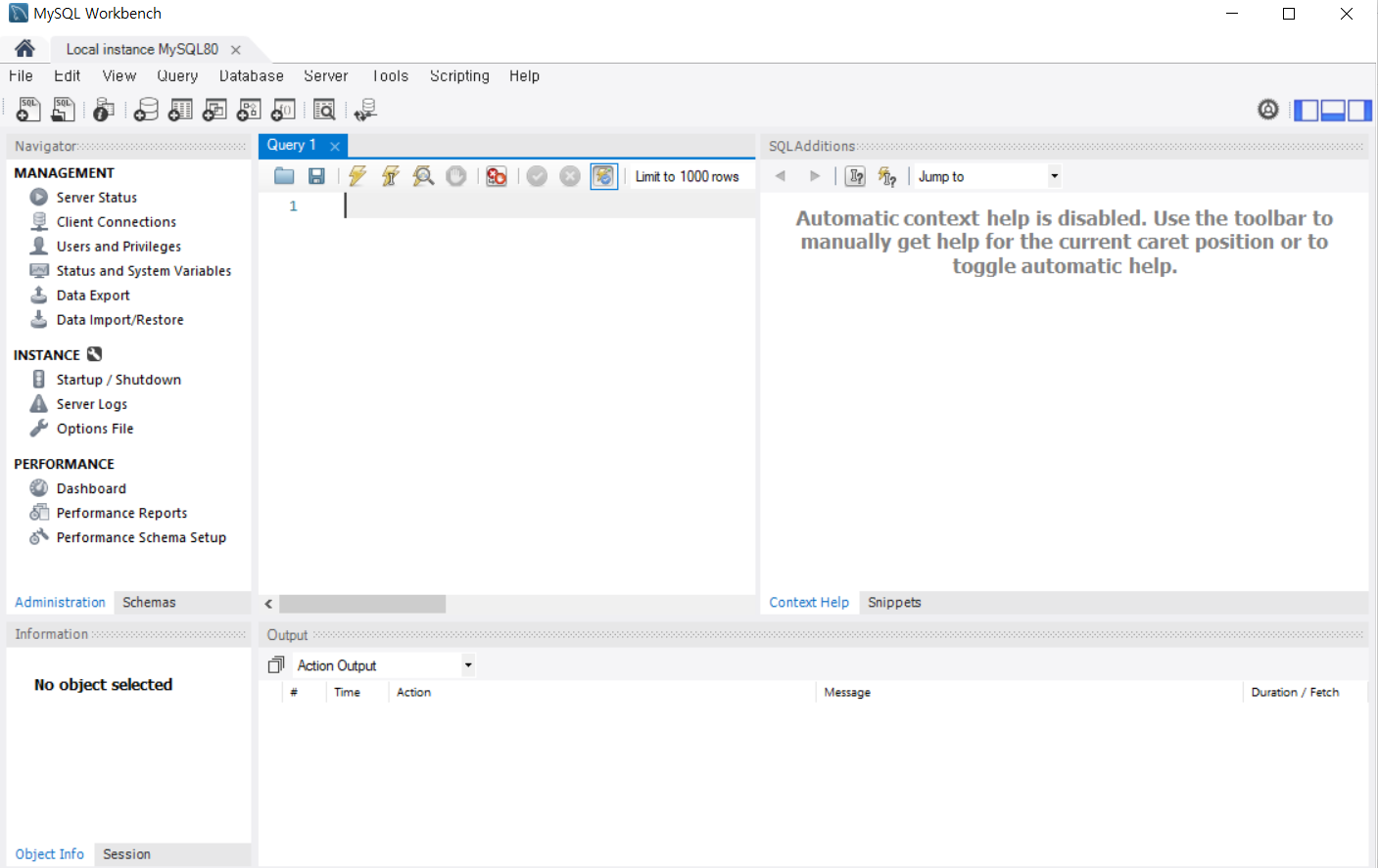 아까 자동실행됐던 Workbench를 다시 열어보자. Workbench는 MySQL을 사용하기 위한 공식적인 GUI 툴이라고 적혀 있다. 좌측 하단의 MySQL Connection 아래의 Local instance MySQL80를 클릭하면 작은 팝업창이 뜬다. 아까 설정한 비밀번호 입력 후 ok 클릭