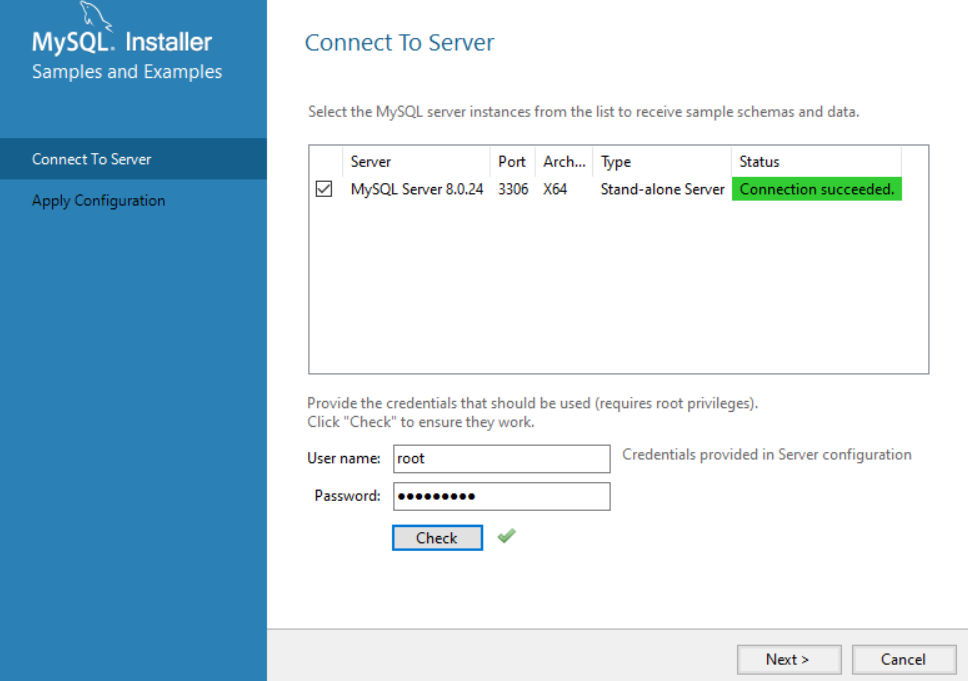 아까 설정한 비밀번호 입력 후 Check 클릭 -> Connection succeeded 뜨면 Next클릭